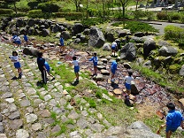 到着して間もなく,本堂の前で集合写真を撮りました。それから,フリータイムとなりましたがさっそく小川に足を入れて,喜んでいる子供たちでした。お昼が近づきますと,ほとんどの子が「お腹が空きました!早くお弁当を食べたいです!」と訴えていました。今回の遠足では,できたばかりの縦割り班で食べました。