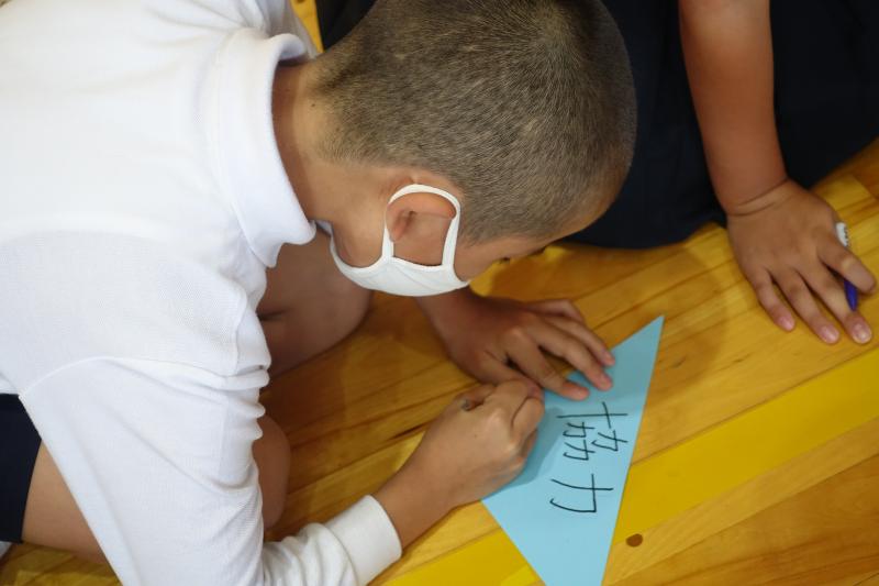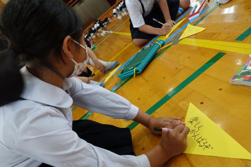 縦割り班ごとに分かれて、画用紙に運動会へ向けての目標やキーワードを書いてロープに飾り、瑞穂っ子オリジナルの万国旗が完成しました。