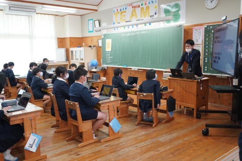 昨年度から導入された児童1人1台付与されたタブレット端末を活用した授業やグループで発表した授業をしていました。