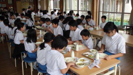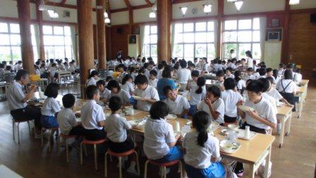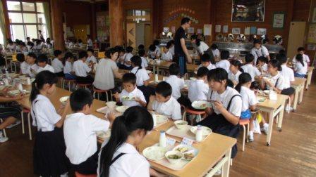 給食当番も2年生から6年生までが入り混じって編成され、多少戸惑う様子も見られましたが、それでも高学年がリードしながら時間通りに配膳を終えることができました。