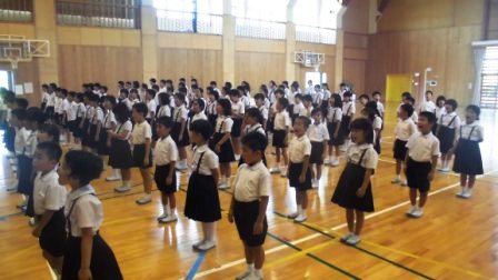 大変暑い日ではありましたが、体育館に入った子どもたちは、大きな声で校歌を歌い、校長先生や生徒指導担当の話をきちんとした態度で聞くことができました。