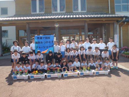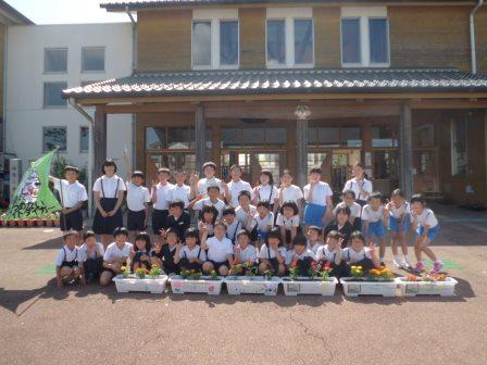 土づくりは5・6年生、花の苗運びは4年生、植えるのは1・2・3年生と役割分担し、みんなで協力してプランターに植えていきました。プランターには、「大きく育ってね」「きれいな花を咲かせてね」などのメッセージやイラストがかかれ、一人一人の気持ちが伝わってきました。最後に記念撮影をしましたが、みんな最高の笑顔でした!