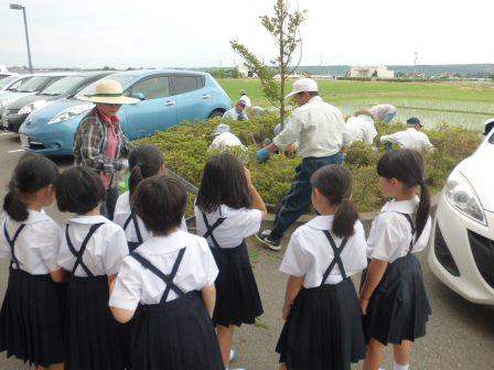 玄関前の花壇や体育館横の花壇など、普段はなかなか目が届かない場所をきれいにしていただきました。除草だけではなく、枯れかけた樹木を掘り起こしたり、植え替えしていただいたりもしました。午前8時30分から始まった作業は、10時30分まで続き、たくさんの草が駐車場の片隅に集められました。最後に、1年生と2年生が「ありがとうございます!」とお礼の言葉を伝えにきました。次々にお礼のあいさつをしながら集団で駆けていく姿は、本校及び周辺を飛び回るツバメのようでした。とてもほのぼのとした光景でした。