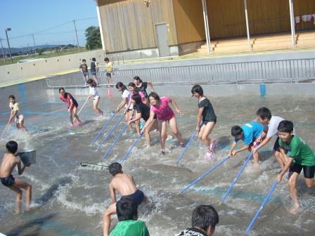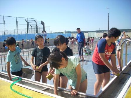 そこで、この日は高学年によるプール掃除を行いました。本校のプールは開校11年目ということもあり、きれいなのですが、強い風に乗って運ばれた砂が沈殿し、泥がたまりやすくなっています。午前中に泥を運び出し、午後からは磨き作業に入りました。子どもたちは水に濡れることも楽しみなようで(!?)、力を合わせてぴかぴかに磨き上げていました。