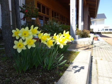 玄関先には,スイセンの花々が太陽をいっぱいに浴びながら咲いています。