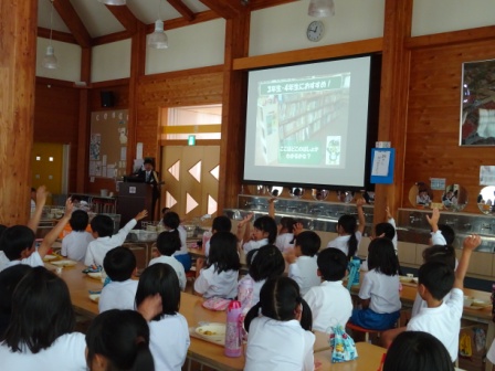 プロジェクターで本を映し出し,興味を惹きつけるお話のあと,