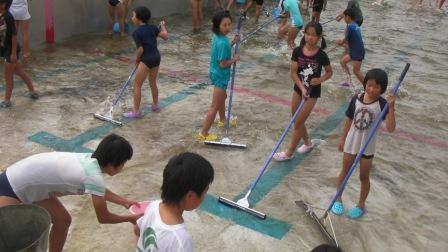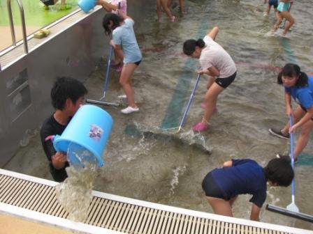 思いのほか,水の抜き具合が遅かったため,「進んで」バケツリレーやデッキブラシで水抜きを試みていました。
