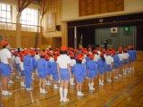 ぜんりょく・しんけん・きびきびを目標に、開会式の行進とラジオ体操をしました。