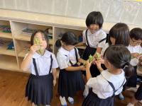 1年生は、畑で育ったオクラを手に、長さを比べてました。