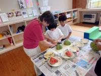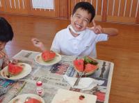 つくし・しらとり教室では、畑で育てたスイカを食べました。