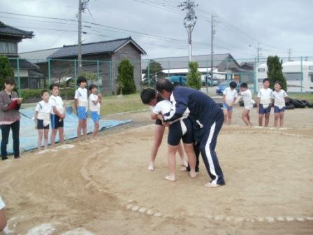 この日の相撲練習では,小雨が降る中,子どもたちに分かりやすく取り口の助言をして