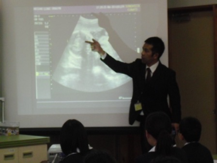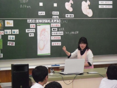 担当の松本教諭が授業の導入部分を,近江養護助教諭がヒトの母体内での成長について知識の部分を,担任の私が我が子の胎児の映像を紹介して,生命の誕生を待ち望む親としての思いを話しました。