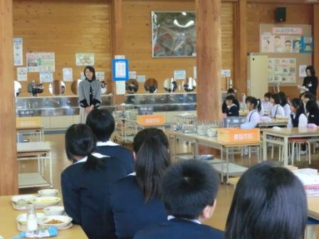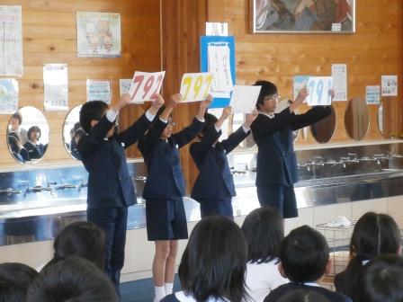 瑞穂小では、毎月の初めに6年生の縦割り班の団長が、ランチルームで前の月のランランジャンプタイム(毎朝一定の距離を走る(冬はなわとび))の結果を発表しています。