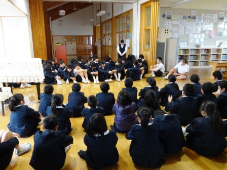 1~5年生が体育館に集まり、始めに式の練習の心構えについての話を聞いてから、