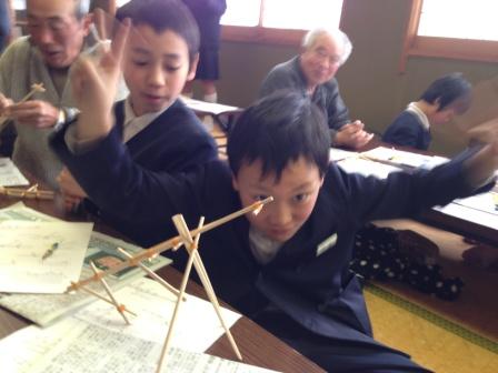 昔農先生からは,わりばしと輪ゴムを使った「わりばしでっぽう」の作り方・遊び方を教えていただきました。