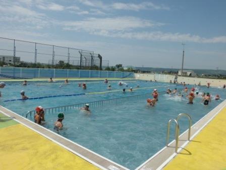 初日のプール開放は,107名もの児童が参加し,さわやかな青空の下歓声を上げていました。