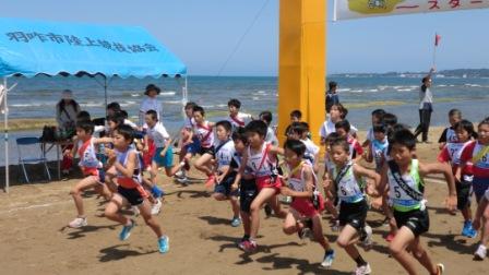 16日(日)晴天の下,羽咋市の千里浜海岸において,第28回千里浜ちびっ子駅伝が行われました。全45チームが出場し,全長約10kmを6人でタスキをつないで走ります。
