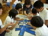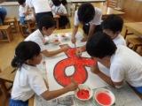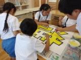 高学年がリーダーシップをとり、大きな紙に色を塗っていきます。