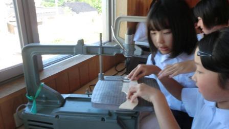 次に針糸をつけます。班でつけ方の手順を確認しながら,慎重につけることができました。