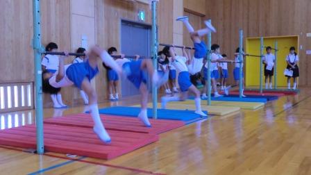 これから始まる鉄棒の学習に向けて,それぞれの学年の児童が得意な技を披露しました。