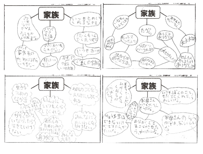 教材を通して感じたことを踏まえ,最後に,もう一度自分のこととして「家族」について考えました。その際,初めて「マッピング」という方法で,自由に自分の考えを深めていきました。たくさん枝をつなげたり,枝分かれをさせたりしながら書いている子が多く,担任はとても驚きました。胸が温かくなるホットなワークシートを,いくつか紹介します。