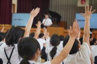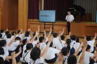校長先生から「瑞穂小学校のいいところは?」と問われた子どもたち。