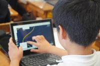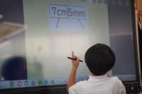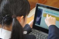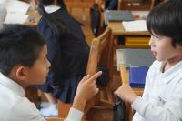 タブレットや電子黒板を活用して,一生懸命に相手に伝えようとする伝える姿。