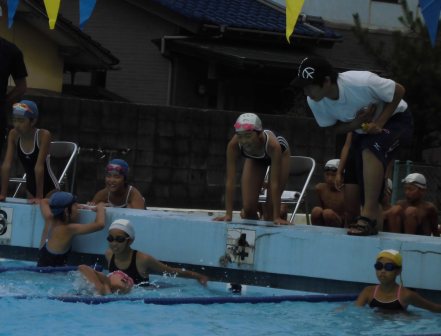 泳ぎが速くなるコツを見つけようと,教えようと,よく考えて行動している瑞穂っ子。