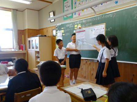 はくい獅子舞保存活性化実行委員会のメンバーである歴史民俗資料館の中野さん、ICT支援員の若狭さんを招き、今まで調べたことや祭りの活性化に向けての提案について聞いていただきました。それぞれ自分たちの町の祭りや獅子舞の歴史や実態を聞き取りやアンケート等で調査し、考えをまとめ、「青春団を作る」「チラシを作成」「ショーをする」「体験会をする」などいろいろな提案がなされました。祭りに詳しいゲストティ-チャー2名も感心され、「どの町も本当によく考えた驚きの発表や提案でした。こんなにすごく、よく考えた内容に本当に驚きました。ぜひ、これからも祭りを大切に地域を大切にしていってほしいです。」とお褒めの言葉をいただきました。
