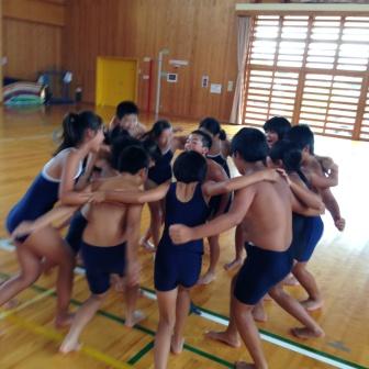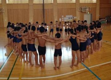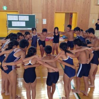 1人1人の泳力もめあても違いますが,円陣を組むことがチームとして一体感を高めることを,