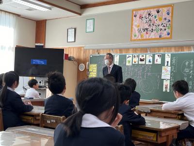 ZOO TIME園長の 藤井 匠也 さん を招き 、 トキの生態や餌 、絶滅や復活までの歴史、守る取組などを学びました。藤井さんは、 トキを世話したり、様々な生き物と関わったりした経験などについても、 写真 や映像を用いながら楽しく説明してくださいました。 子どもたちは、 実際のトキの羽や卵を見せてもらうと、食い入るように見ていました。卵に光を当てた映像では「あ!動いとる!」と興奮しながら 見入って い ました。 5年生は、トキの学習や野鳥観察などを行ってきた ため、 少し発展 した内容も含み 、鳥はなぜ 飛べるのか、トキのために何ができるのか 、などについても考えました 。トキの放鳥への期待と保護への思いがさらに高まりました。