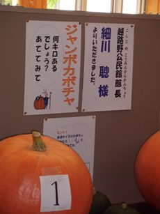 立秋を迎え,越路野公民館の細川様が立派な秋の実りを届けてくださいました。早速玄関に飾らせていただきました。児童玄関に重量あてクイズの形でふれあえるコーナーにしました。