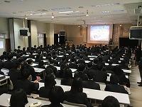 12月16日(水)公益社団法人 福井被害者支援センター 相談員の宮地美貴子氏を講師に招き、「命の大切さを学ぶ教室」として、交通事故に遭った長男(当時小学6年生 11歳)のお話を聞かせていただきました。交通事故の悲惨さと命の貴さ、親というものはいつまでもわが子のことを思いたいのに、思う子がいない切実な思い、車は時には人の命を奪う凶器になることなど、たくさんのことを教えていただきました。講話後、感謝の意を込めまして生徒を代表して、南保さんのお礼の言葉と村井くんの花束贈呈を行い、「命の大切さを学ぶ教室」を閉じました。次の写真は、講話中の写真と感想文を書いている写真です。