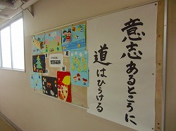 新学期の初日に合わせて書道部が書いてくれていた。今月は家庭の「子ども文化」という授業で作った作品も横に並んでいる。