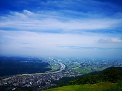 2019年8月16日 10時27分 お盆休み、獅子吼に登った。ひと汗かいて着替え、ゆっくりと眺める扇状地。やっぱり気持ちいい。何がいいかって、広がっていくというのがいい。