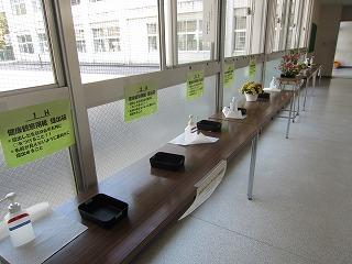 学校では今年度も引き続きコロナ感染対策。各学年の玄関には、生徒が自宅で体温を測って記入した用紙の提出場所を設けてあります。忘れた生徒は、先生から予備用紙を渡され、その場で記入した後、提出します。