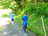 草刈りの説明! 刈られた草が斜面や側溝に落ちるので、それを別の場所へ 校長先生もお手伝いに!