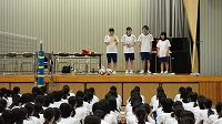 7月7日(火)に表彰伝達式と壮行式が行われた。レスリング部、女子ホッケー部、放送同好会が素晴らしい成績を残してくれた。また、全国総体に出場するレスリング部や夏の甲子園大会予選を戦う野球部、中部日本大会に出場する卓球部、県コンクールで演奏する吹奏楽部、「民家の甲子園」全国大会に出場する放送同好会には日頃の練習の成果を十分に発揮してほしいと思います。