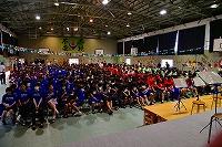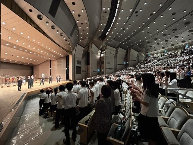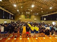 吹奏楽の音楽に合わせて全校生徒で校歌を歌い、選手にエールを送りました。