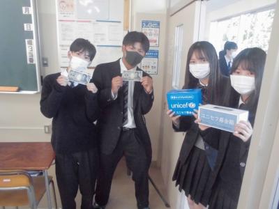 生徒会はユニセフ、JRC部は赤い羽根の募金活動を行います。