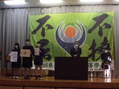 また、北信越大会の壮行式も行われました。出場する部活動は、ボクシング部、レスリング部、女子ホッケー部、商業同好会の方々です。出場する選手の方々は頑張ってきてください!