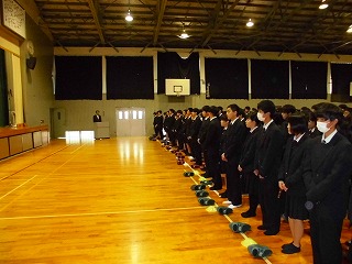 3学期始業式が行われました。校歌斉唱の後、校長先生から全校生徒に向けて、一人一人がどう行動すべきかをよく考えてほしいということ、また、「1年の計は元旦にあり」と同様に、「1日の計は朝にある」ということを大切にしてもらいたいというお話がありました。