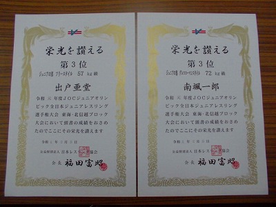 昨年12月25日に行われたJOCジュニアオリンピック全日本ジュニアレスリング選手権大会 東海・北信越ブロック大会において、出戸亜堂君はジュニアの部 フリースタイル57㎏級第3位、南颯一郎君はジュニアの部 グレコローマンスタイル72kg級第3位となりました。おめでとうございます!
