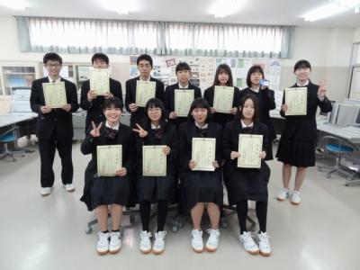 専門高校と違い、2年次から専門科目の学習をスタートするため、短期間で検定にチャレンジしなければならないハンデをもろともせず、昨年の記録を塗り替え、11名が3種目以上1級を取得することができました。