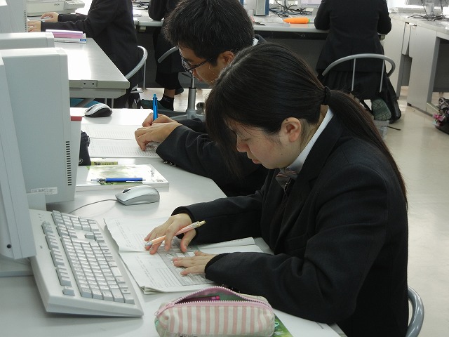 総合学科の本校は、2年次から4つの系列に分かれ、商業系列を選択した生徒は、全国商業高等学校協会主催の検定試験にチャレンジします。