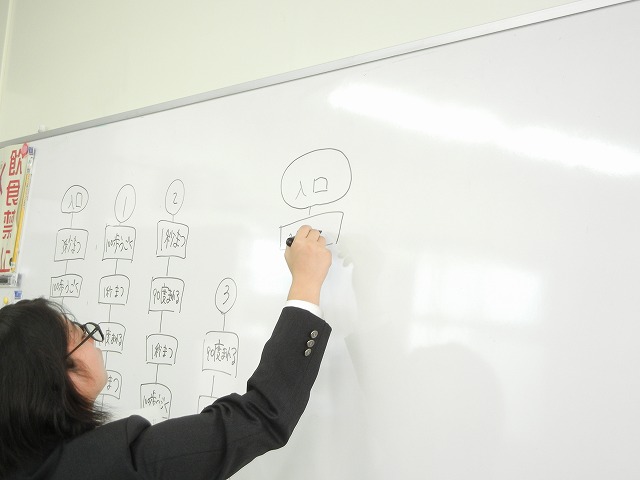 3年生では、今、フローチャートの記入方法を勉強しています。同じ動きのするプログラムを考える課題でも人によってフローチャートが変わってきたりします。テンプレートを使用しながら丁寧に記入しています。