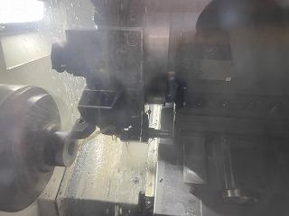 材料をチャッキングして・・・ 切削スタート!白っぽい液体は潤滑と