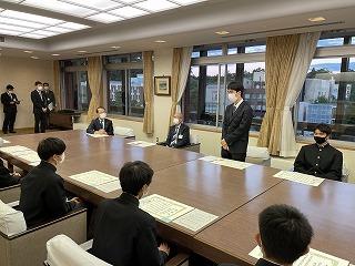 山野市長より表彰状を受け取る田城くん    懇談では卒業後の抱負を語りました