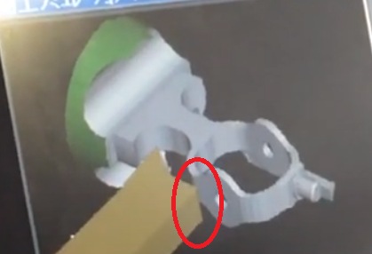 最初はこんなにうまくいかず、「円弧方向が右左逆」「加工面が90度違う面」などのミスが多く、シミュレーション結果が破砕された状態になっていました。