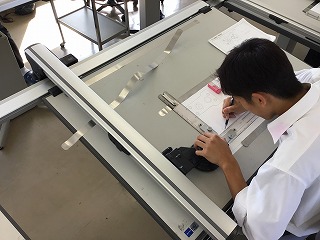 製図は工業系列の基本です。コンピュータ製図もありますが、ドラフターを使って